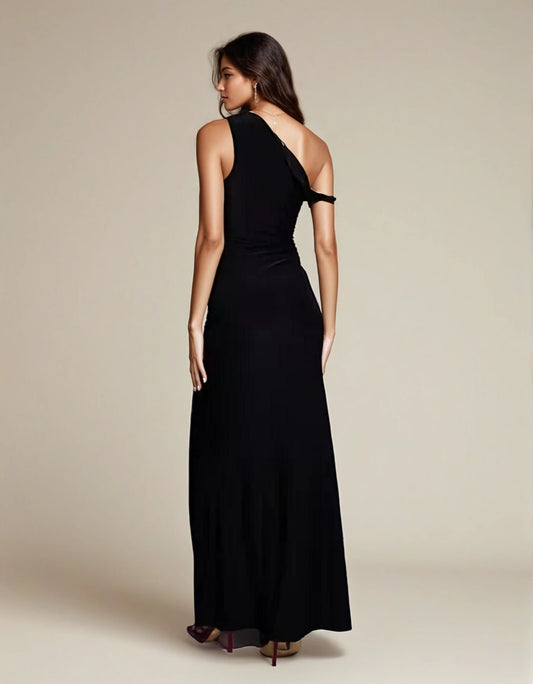 Exclusive Double Sculpted Slinky Ruffle Shoulder Maxi Dress in Black
