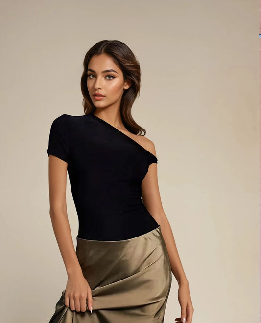 Exclusive Double Sculpted Slinky One Shoulder Fold Over Top in Ivory